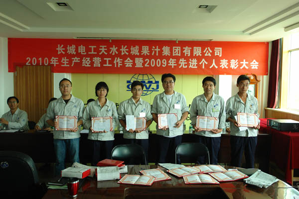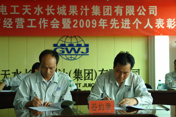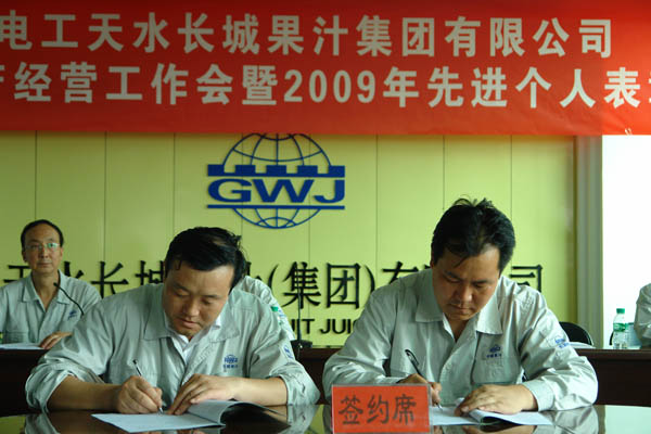 王小宏总经理分别与四个子公司经理签订了《2010年度榨季生产经营目标考核责任书》。 柳军民董事长从认真做好“十二五”发展规划,全面贯彻公司整体发展战略、正确认识预防腐败重要意义,全面落实公司“三重一大”实施细则等方面作重要讲话。他首先分析了市场形势,对于如何做好2010榨季生产经营工作,提出了要求:一是市场理念的转变,要建立健全市场服务体系,提高售前、售中和售后服务。二是做好从产品的质量、过程的控制、差异化、产量的要求及外协加工等方面的工作,以推动公司2010榨季生产经营目标任务的完成。 党委书记、工会主席王根成宣读了公司党政表彰决定。分别对2009年度先进集体、个人进行了表彰奖励。 王根成书记指出,今年果汁行业的形势不容乐观,企业发展和生产经营任务繁重而艰巨,本次会议对2010榨季生产经营各项工作进行了周密的安排和部署,我们一定要按照公司提出的“1、2、3、3、3”的2010榨季生产经营指导思想认真贯彻学习落实,在公司党委、董事会的正确领导下,强化管理,提高执行力,团结和带领全体员工坚定信心、勇于开拓、团结奋进、共谋发展,以高昂的斗志、顽强拼搏的精神,锐意进取、扎实工作,为全面完成今年公司制定的各项生产经营目标任务,努力开创长城果汁改革发展的新局面而努力奋斗!