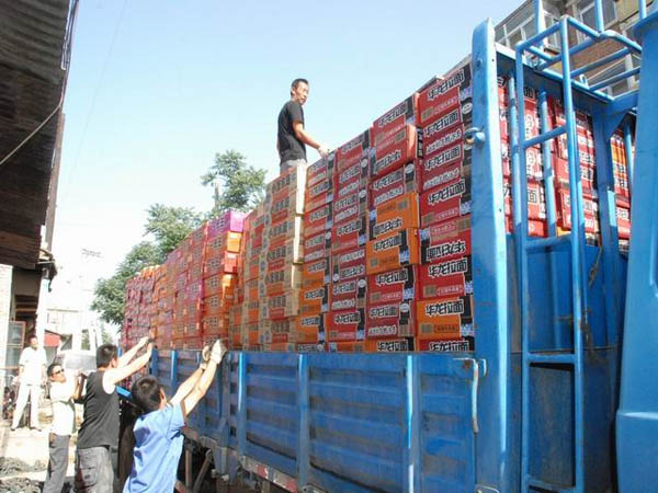 8月15日一大早,长开厂公司和二一三公司领导又亲临装运现场,指挥物资装运,上午11时许,救灾物资装车完毕,由长开厂公司支援的1551箱方便面、60件火腿肠、5件榨菜和长城电工二一三公司支援的2210箱矿泉水,总价值74138元的救灾物资由天水长开公司党委书记白天洪和二一三公司党委书记杨大友带队火速送往白银公司厂坝铅锌矿。