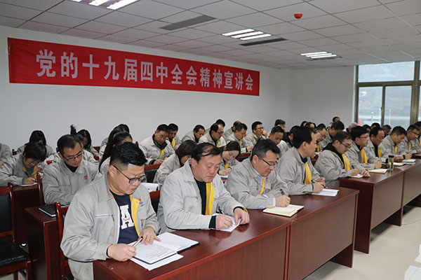 12月31日上午,甘肃省国有资产投资集团有限公司党委副书记、工会主席张心灵到天水长城果汁集团有限公司宣讲党的十九届四中全会精神,长城果汁全体党员和干部员工60余人参加了学习。