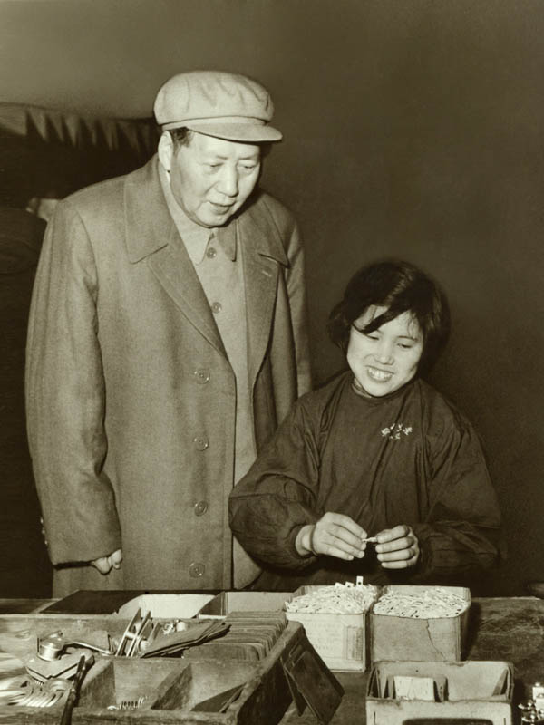 图为:1958年2月13日,毛泽东主席视察二一三公司。 天水二一三员工苏玉春(健在)一边装配产品一边激动地回答毛泽东主席亲切的询问。